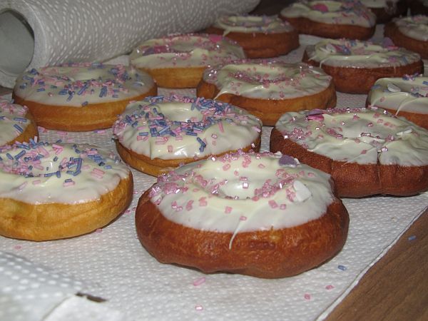 Dann hat der Mann bravmeinen Dreck seine Küche sauber gemacht, damit ich diese leckeren Teile fabrizieren konnte... sie sind nicht ganz so fluffig wie die gekauften, aber lecker... und damit es auch noch amerikanisch aussieht habe ich die Reste vom Geburtstag der Mitteltochter verwendet: